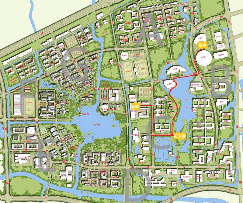 从海洋大楼钟楼下领券出发步行,按照图示路线,在飘萍路与蒲场路路口完成打卡,至体育馆北面领取活动纪念品。