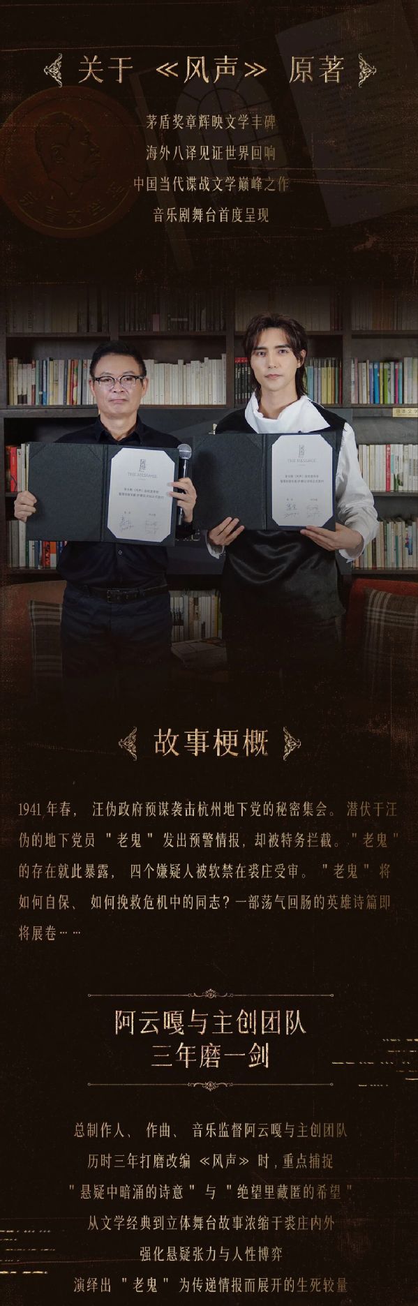总制作人、 作曲、 音乐监督阿云嘎与主创团队历时三年打磨改编中国当代谍战文学巅峰之作《风声》 ,通过25首的歌曲映射角色在绝境中的真实心境。环环相扣的歌曲将再次呈现这部文学经典中地下党员“老鬼”为传递情报而展开的生死较量和人性博弈。沉浸式共同观影体验“悬疑中暗涌的诗意”与 “绝望里藏匿的希望”。