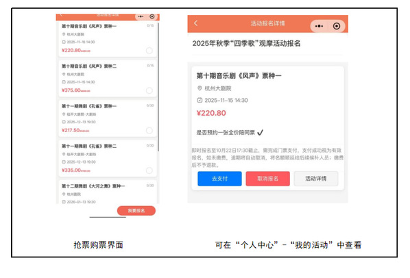 本次“四季歌”观摩活动使用“智慧工会”小程序开展,会员登录“智慧工会”移动端,点击“活动报名”进入“四季歌”活动进行抢票购票。