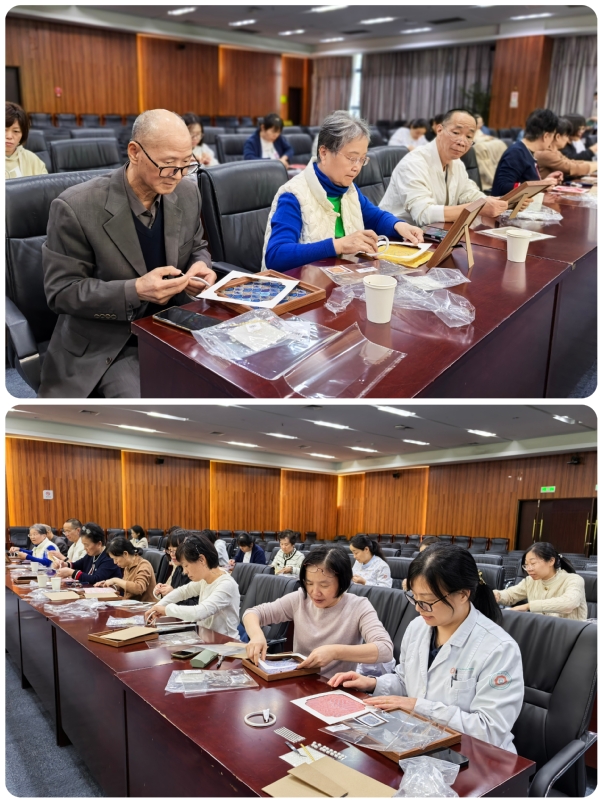 非遗珍珠画创作传递匠心。身心放松后,非遗珍珠画DIY环节拉开帷幕。宋锦底料的细腻纹理与珍珠的莹润光泽相映成趣,职工们手持工具,先将宋锦剪裁拼贴、用酒精胶固定在底板上,再循着预设图案挑选珍珠,细致粘贴。“年轻时只听说宋锦金贵,没想到今天能亲手用它做画!”一位退休职工戴着老花镜,沿着桂树轮廓粘贴珍珠,语气里满是欣喜。不一会儿,玉兔、窗棂、桂花等纹样在锦缎上渐显,珍珠的立体光泽让平面作品焕发出层次美感,指尖创作间满是成就感。