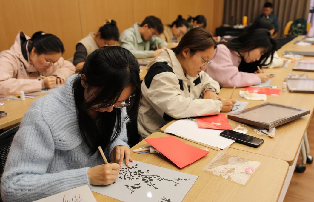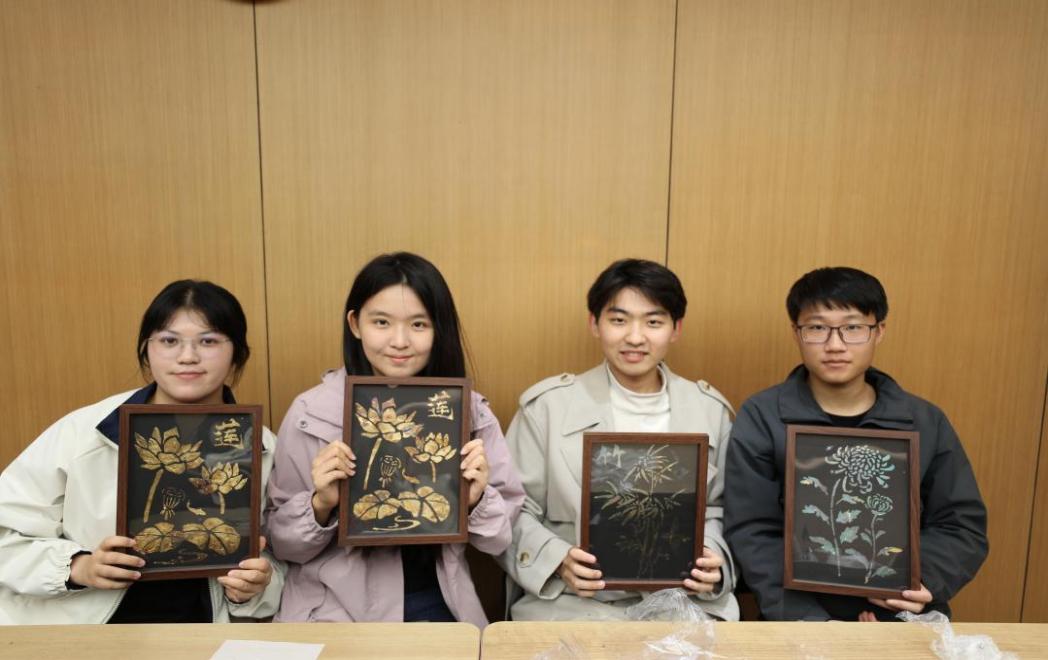 创作过程中,大家专注勾勒图案轮廓,细心涂抹特制胶水,静待片刻后精准粘贴烧箔纸,每一个步骤都饱含专注与期待。师生们不时交流技巧心得,留学生同学对烧箔画独特的金属质感与传统韵味表现出浓厚兴趣,主动向身边师生请教,现场氛围热烈而温馨。活动尾声,来自不同院系、不同国家的师生们手持亲手完成的作品合影留念,让镜头定格这份跨越界限的文化共鸣与真挚情谊。