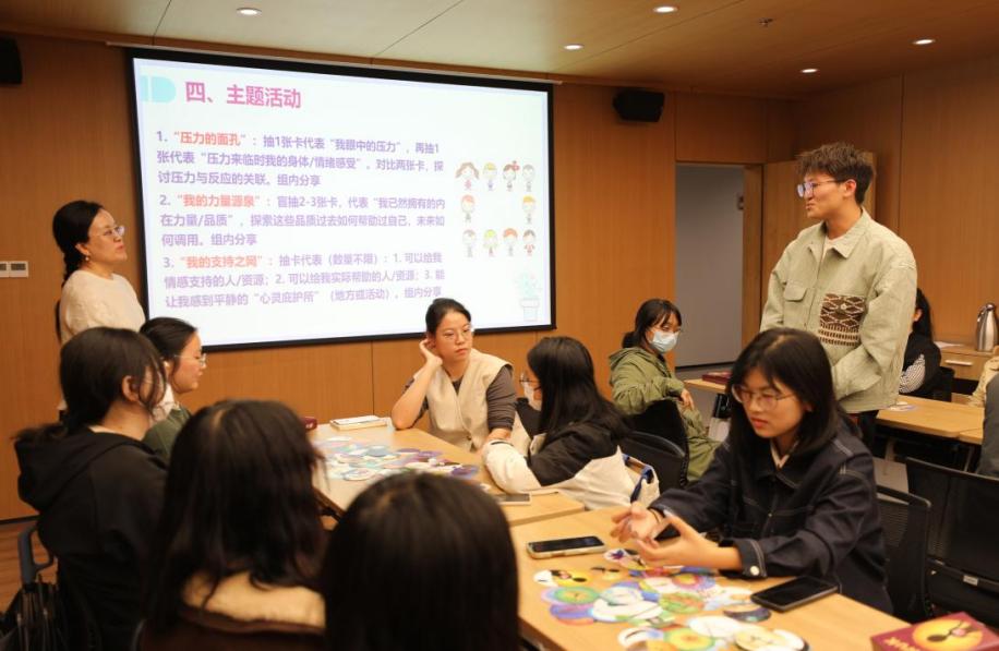 在张慧老师的专业引导下,师生们借助卡牌图像开启与自我潜意识的对话。活动围绕三大主题展开:“压力的面孔”环节中,大家抽取卡牌分别代表“我眼中的压力”与“压力来临时的身心感受”,通过对比探讨压力与反应的内在关联;“我的力量源泉”环节里,盲抽卡牌探索自身已有的内在力量与品质,分享这些特质过去如何提供支持、未来如何持续调用;“我的支持之网”环节中,大家自由抽卡,梳理能提供情感支持、实际帮助的人或资源,以及能带来平静的“心灵庇护所”。各小组内,师生们真诚分享个人感受与生活故事,从不同角度解读压力来源,共同梳理工作、学习与生活中的挑战,在交流中获得理解与启发,现场互动踊跃、氛围暖心。