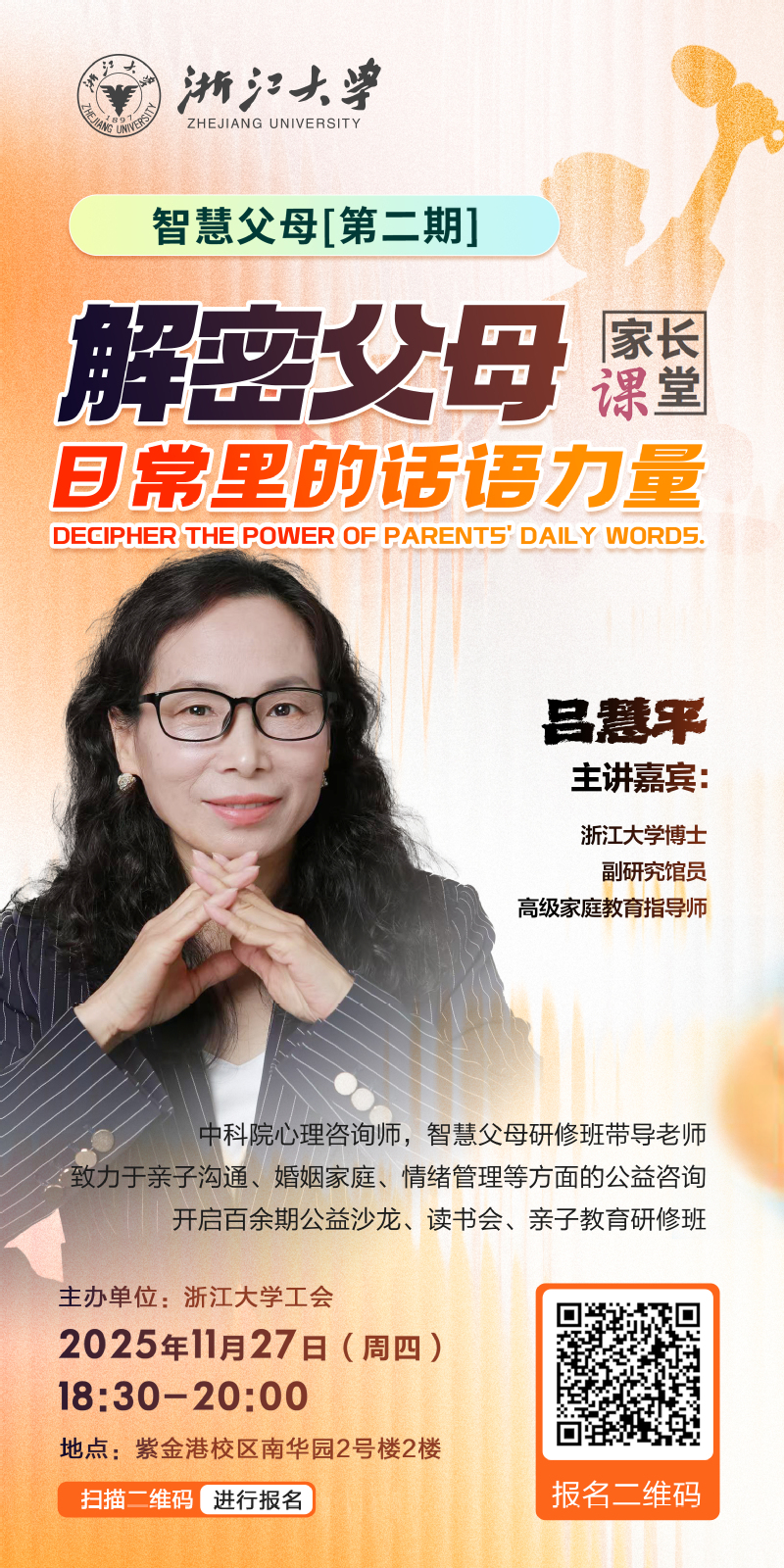 浙江大学博士,副研究馆员 ,高级家庭教育指导师,中科院心理咨询师,智慧父母研修班带导老师。致力于亲子沟通、婚姻家庭、情绪管理等方面的公益咨询,开启百余期公益沙龙、读书会、亲子教育研修班。