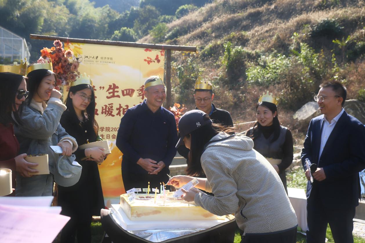 今年恰逢学院“‘经’生四季,温暖相伴”集体生日会走过第八个年头。仪式上,苗建军、王义中、李济沅分别致辞,为16位秋季寿星送上祝福。唐吉平老师作为寿星代表作交流发言。由张川川、李济沅颁赠的“福禄双收”主题葫芦摆件与“福寿绵长”佛手礼盒,承载着学院工会的深情厚谊。伴随着生日歌响彻山谷,寿星代表们共同切开蛋糕,快门声定格下这满是温情的瞬间。