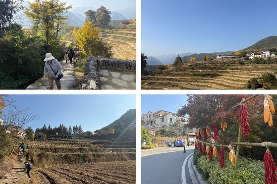 抵达指南村时,恰逢村内秋景正盛。作为太湖主源南苕溪的发源地,指南村既有天目山东麓的灵秀自然风光,更藏着“古姓、古塘、古树、古祠、古庙、古宅”的“七古”人文底蕴。沿村落小径前行,连片的田垄错落分布在山间。刚刚完成收割的土地上,金黄的稻茬整齐排列,阳光洒在田埂间,勾勒出层次分明的线条,仿佛大地精心绘制的五线谱。教职工们纷纷走进田垄间,脚下是松软的泥土,鼻尖萦绕着淡淡的稻香,大家放慢脚步,或驻足远眺田垄与远山的交融之景,或俯身观察稻茬的形态,不时与身旁同事交流着对自然馈赠的感慨,沉浸式感受这份质朴而厚重的秋日馈赠。