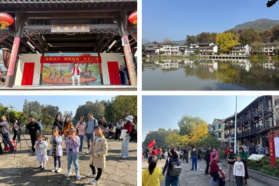 漫步村落深处,上百棵古树构成的“天然氧吧”更令人心旷神怡——近九百年树龄的古木枝干遒劲,枫香树红得似火,银杏树黄得如金,柳杉、麻栗等树种错落其间,五彩斑斓的枝叶与青瓦白墙的古宅、山间的田垄相映成趣,宛如一幅立体的秋日画卷。教职工们或与同事在古树旁定格秋景,或带着孩子在田垄间辨认农作物,还有的沿着古塘漫步,深刻体会“指南秋叶枫最红,天池人家古韵浓”的独特韵味。教职工们在游览古村,探寻古祠古庙历史故事的同时,在秋日暖阳下畅谈工作感悟与生活点滴。