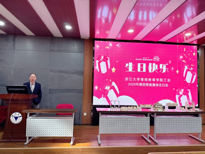 2025年12月15日中午,华家池校区东大楼200教室内暖意融融、笑语盈盈,浙江大学继续教育学院工会精心策划的第四季度集体生日会在此温情启幕。学院领导班子全员出席,与来自各部门的50余名寿星们欢聚一堂,共同定格属于“大家庭”的温馨时刻。