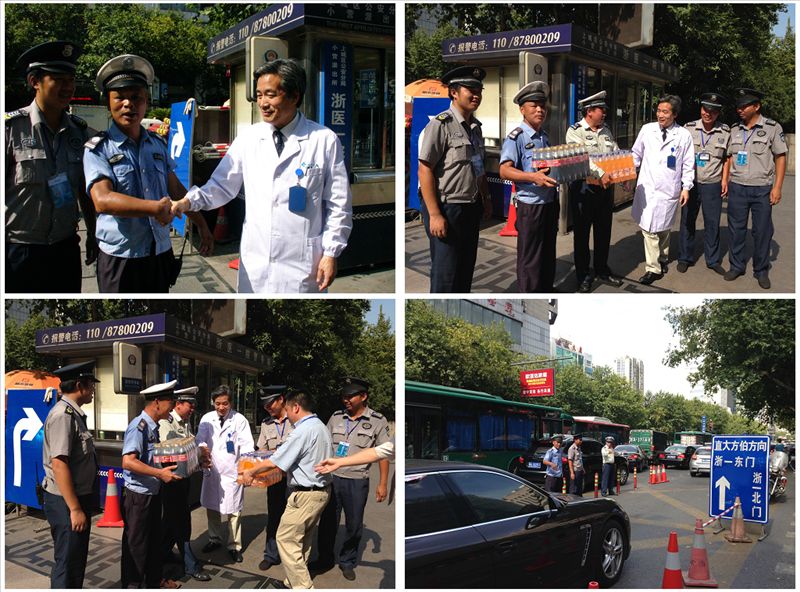 厉有名主席把消暑降温饮料亲手交给了正在执勤的保安同志,对冒着高温坚守岗位辛勤工作的保安人员表示亲切的问候,表扬了他们的认真工作,吃苦耐劳的精神,对他们为医院的安全、交通秩序的维护表示感谢并嘱咐他们注意劳逸结合,以便为病人提供更好的服务。