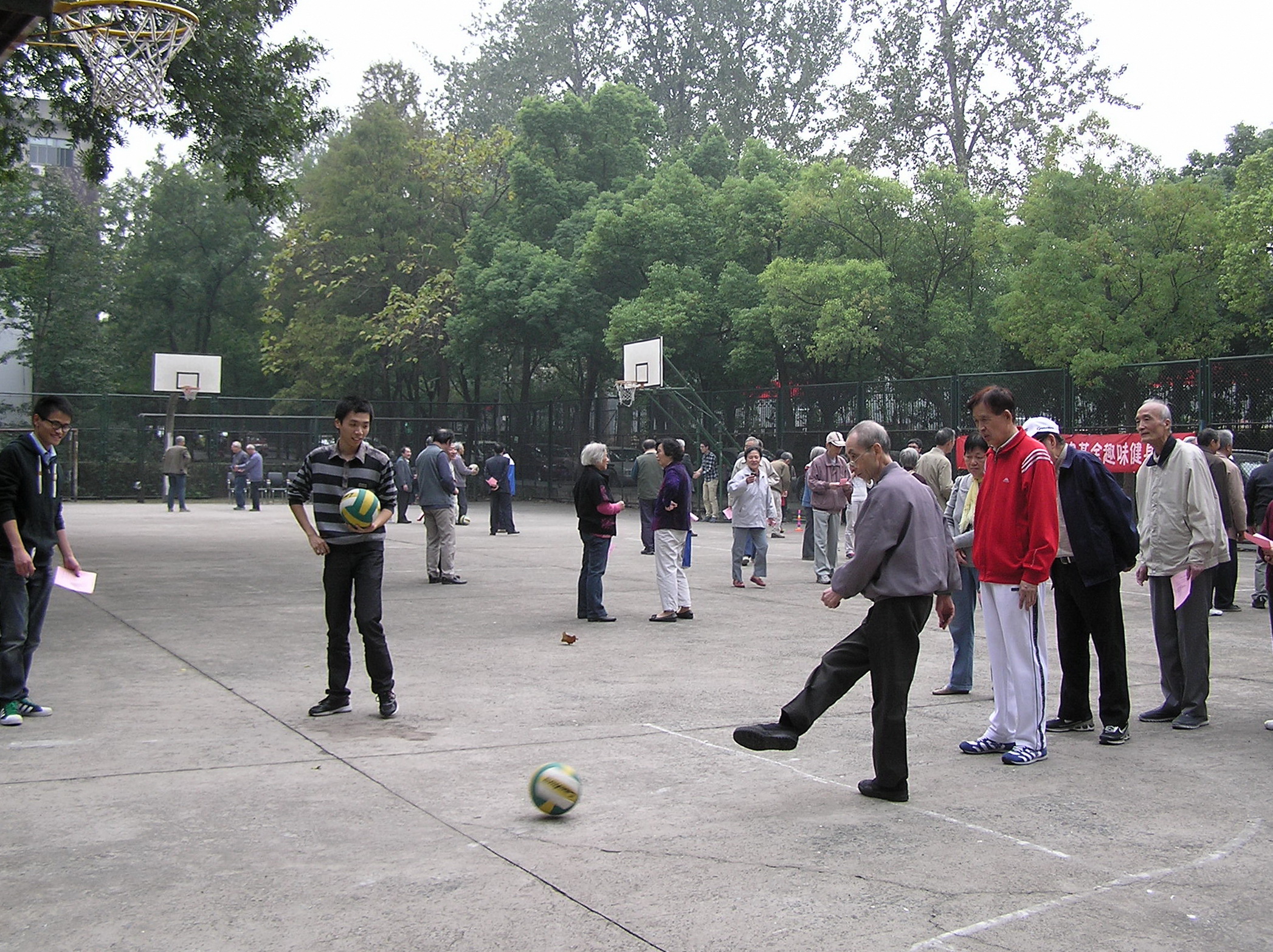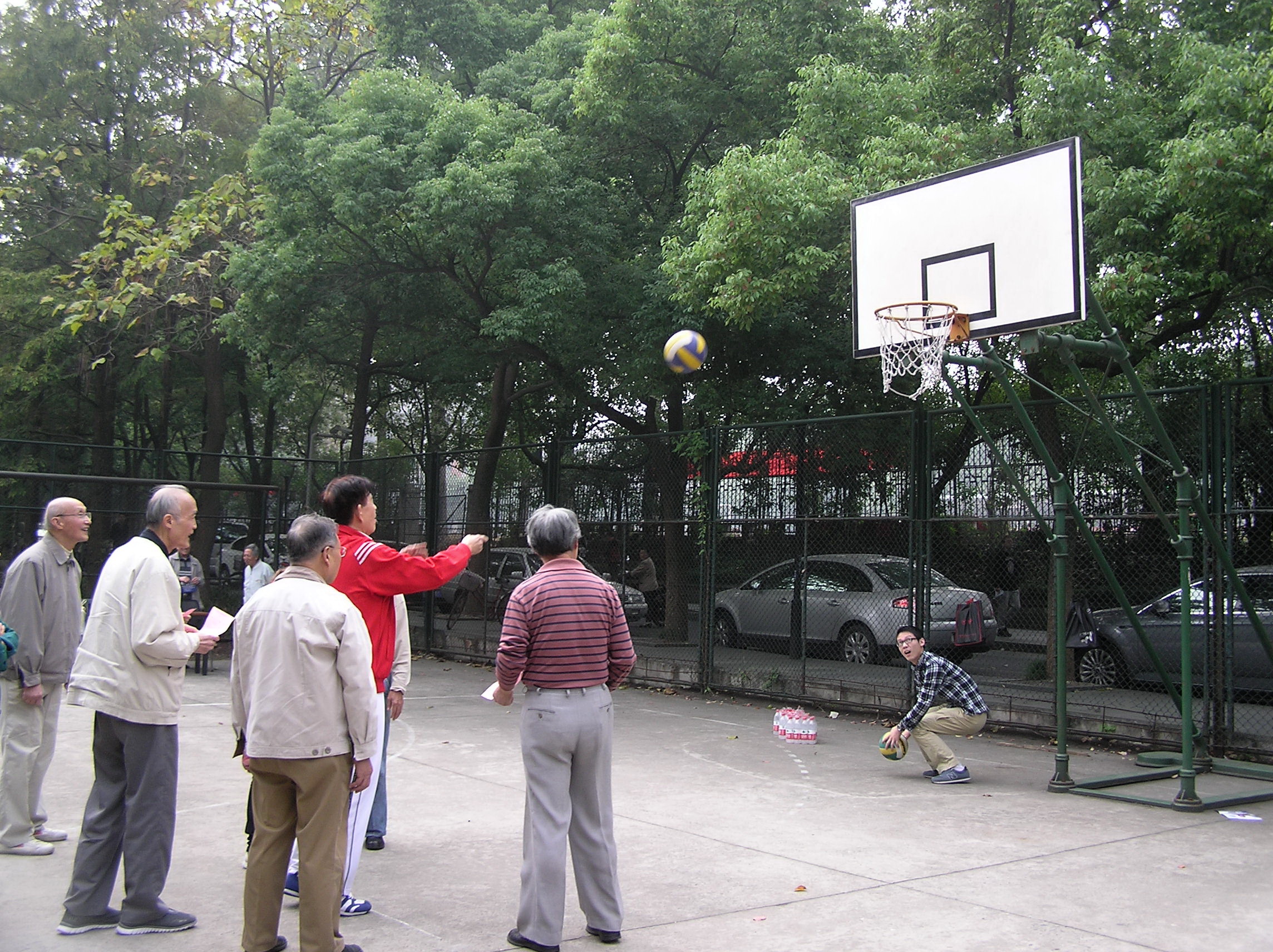 篮球场上早已布置好了6个项目:投篮、打“保龄球”、丢沙包、套圈、足球进门和手握球拍带球走。这些项目都是经过仔细考虑挑选出来的,一方面要保证一定的运动量和趣味性,更重要的是还要保证老教师的安全。既要使大家玩得尽兴,又要让老教师们能安安全全、快快乐乐地度过这相聚的短暂时光。运动间隙,大家谈笑风生、家长里短,好不快乐。