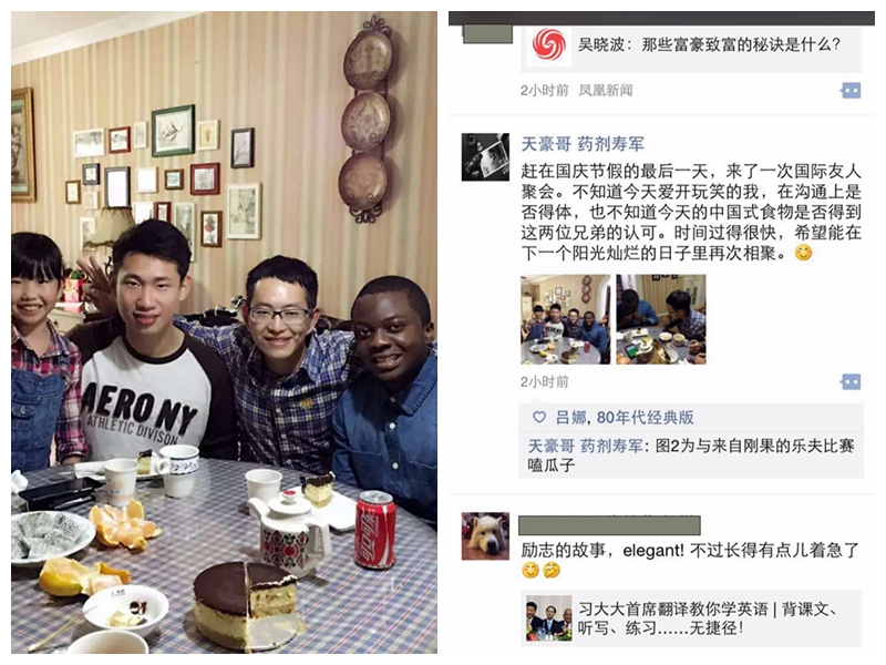 我把刚果的Ralph W (乐夫)和印尼的Joshua (赖德良)接到我家,茶余饭后开始闲聊。 先从“非洲人喜欢吃烧烤(barbecue)不怕引起火灾?”、“印尼的饮食为何和中国相似?”等饮食问题开始,Ralph W (乐夫)甚至把第一次学习使用筷子时,一手拿一支的场景模仿给我们看,害得我们捧腹大笑,练出人鱼线为止。不知何时,聊起了在外求学的思乡之情。可怜的Ralph W (乐夫)在外六年了没回过家,让我这个旁观者深深切切地感受到在外求学实属不易。接着谈起了各自的从医梦想:Joshua希望成为无国界医生组织(Doctors Without Borders)的一员,而Ralph W想学成归国,做一名神一样的令人尊敬的心脏外科大夫。而我做为他们的老大哥(PS:年龄整整差了一轮多),也不时分享着一些人生感悟。10月6日,尽管是个雨天,我和我的家人却过得分外充实,相信另外两位“兄弟”也有同样的感受吧?期待下次相遇!