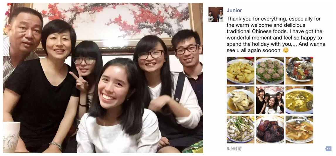 Junior 是一个富有朝气的泰国女孩子,有着忽闪忽闪的大眼睛。其实在见面之前一直忐忑,因为口语不是很好,担心沟通会有障碍。不过junior非常贴心,在接她去我家的路上,她很认真的理解我蹩脚的口语,尽量用简单的词组慢慢跟我聊天,介绍她自己的情况,碰到我理解不了,还主动用软件翻译给我看。到了我家,她用泰式的礼仪向我爸妈问好,十分尊重,对家里的小宠物保持好奇。我们互相分享了手机里的小照片,她的家庭、同学,她的留学生活。她告诉我想成为一个儿科医生,我们对职业规划聊了好久好久,跨国交流收获颇深。她对中国菜很有兴趣,东坡肉什么的,很捧场,每个菜都拍照了。后来我发现她的中文很不错,吐字清晰,还能用中文简单的跟我爸妈互动。Junior的妈妈也很热情,通过视频谢谢我们的招待,并邀请我们去曼谷作客。国庆节后Junior到滨江院区上课,很贴心地帮我带去了爱心早餐,感谢工会给我们一个跨国友谊的机会!