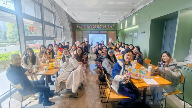本次生日会参与人数众多,寿星们分坐两列,场面更显热闹隆重。大家共享甜蜜蛋糕与丰盛午餐,交流工作生活心得,在合影留念中绽放出灿烂笑容。